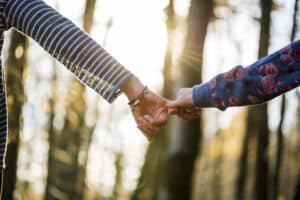 Low angle view of two female friends or partners holding pinkies